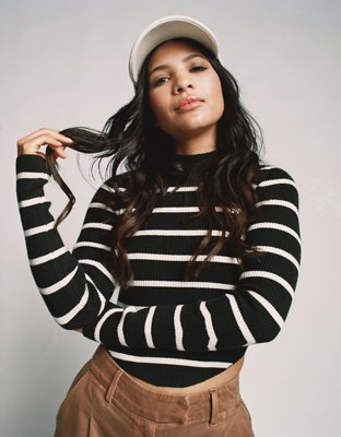 Karen Scott offers up a zip-front jacket designed with a sleek mock neck and finished with nautical stripes.