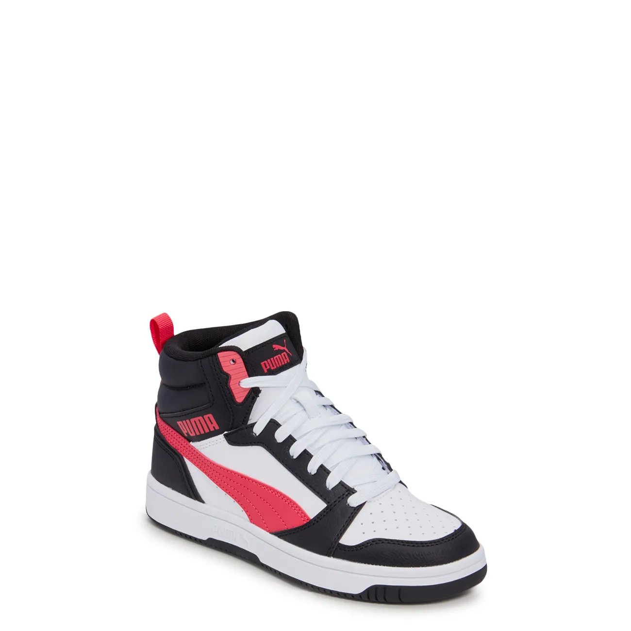 Trendy and comfy, these boy's Puma Rebound V6 white/black/racing blue mid-top sneakers have durable synthetic leather upper made of at least 20% recycled materials for sustainability and perforations at the toebox for breathability. These retro-inspired basketball sneakers have a ace-up closure for a perfect fit, SOFTFOAM+ sockliner with extra thick heel for enhanced cushioning support as he takes every step. Rubber midsole and outsole offer reliable shock absorption and traction.