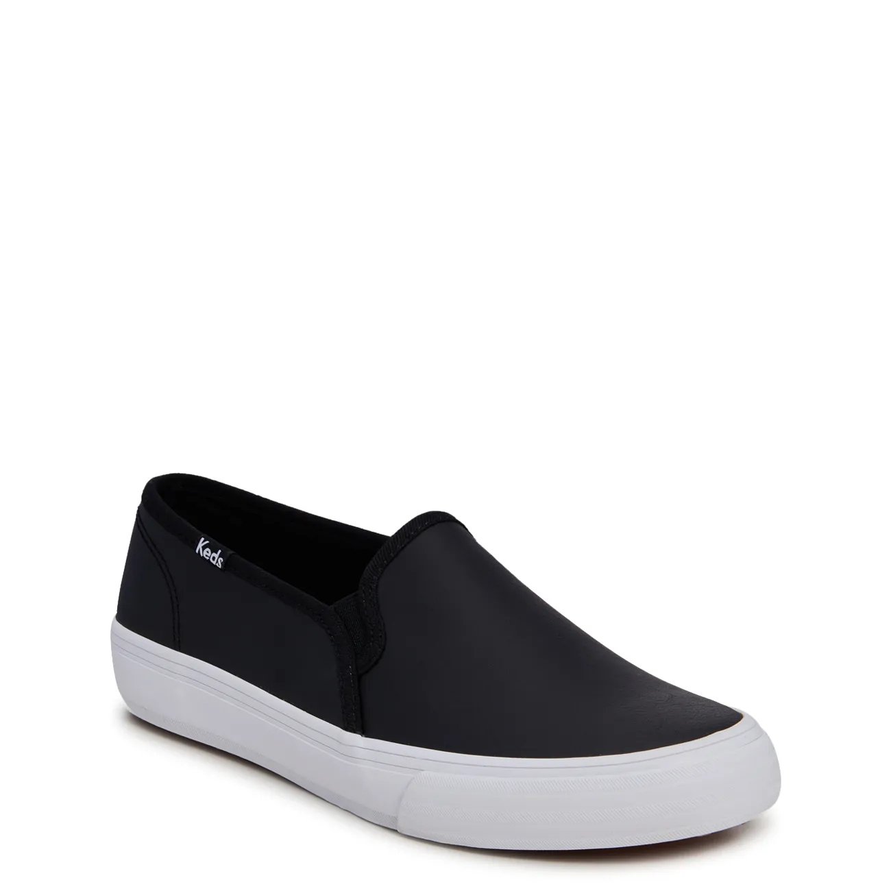 The women’s Double Decker black/black slip-on sneaker from Keds is a comfortable and stylish option perfect for everyday wear. Crafted with leather upper, these casual kicks have a round toe and slip-on design with dual gore elastic inserts for a snug fit and easy wearing. Soft, breathable twill lining lends a comfy feel. The Softerra™ memory foam footbed made with 10% recycled PU foam offers long-lasting sustainable comfort. A rubber outsole ensure flexibility and good grip.