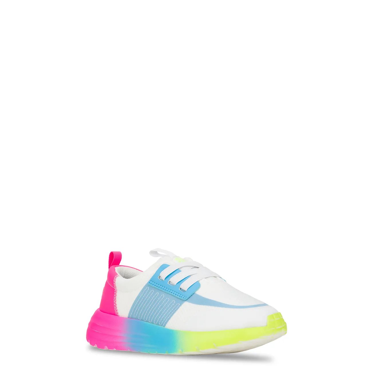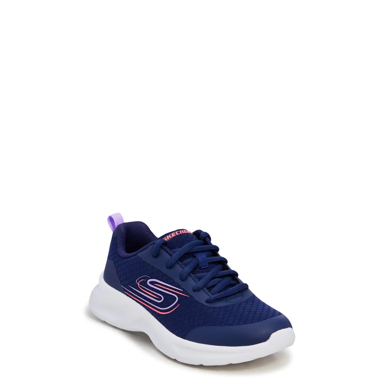 These girl's Skechers GO RUN® Accelerate light pink/multicoloredhook and loop athletic shoes offer ultimate comfort and support to those active feet. These lightweight running sneakers come with synthetic sparkle mesh upper for a dazzling appeal, stretch laces and adjustable instep strap for adaptive closure and customized fit, and soft synthetic textile lining. Skechers Air-Cooled Goga Mat™ breathable insole with high-rebound cushioning and EVA midsole cradle her feet with each step. Rubber outsole provides high flexibility, durability, and grip.