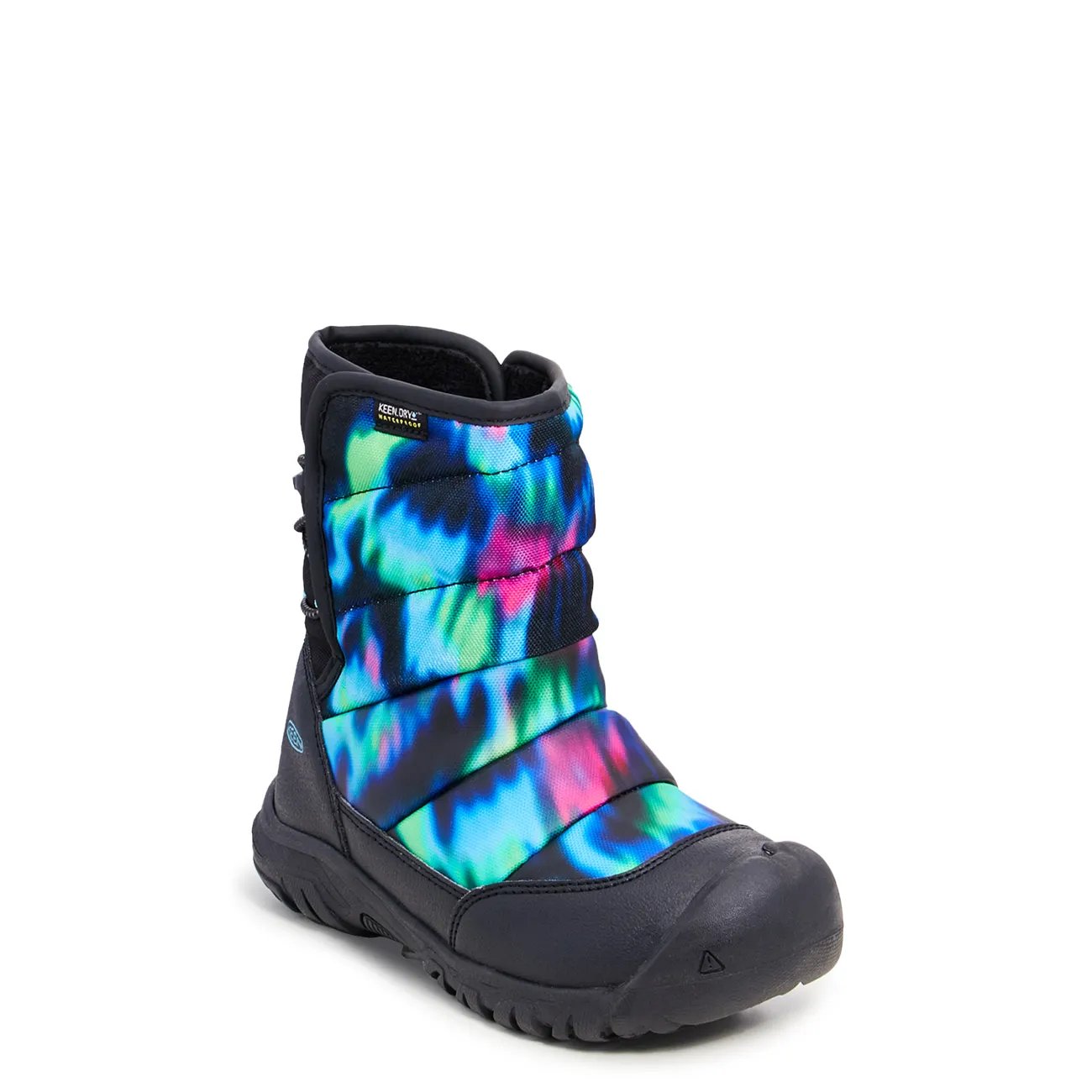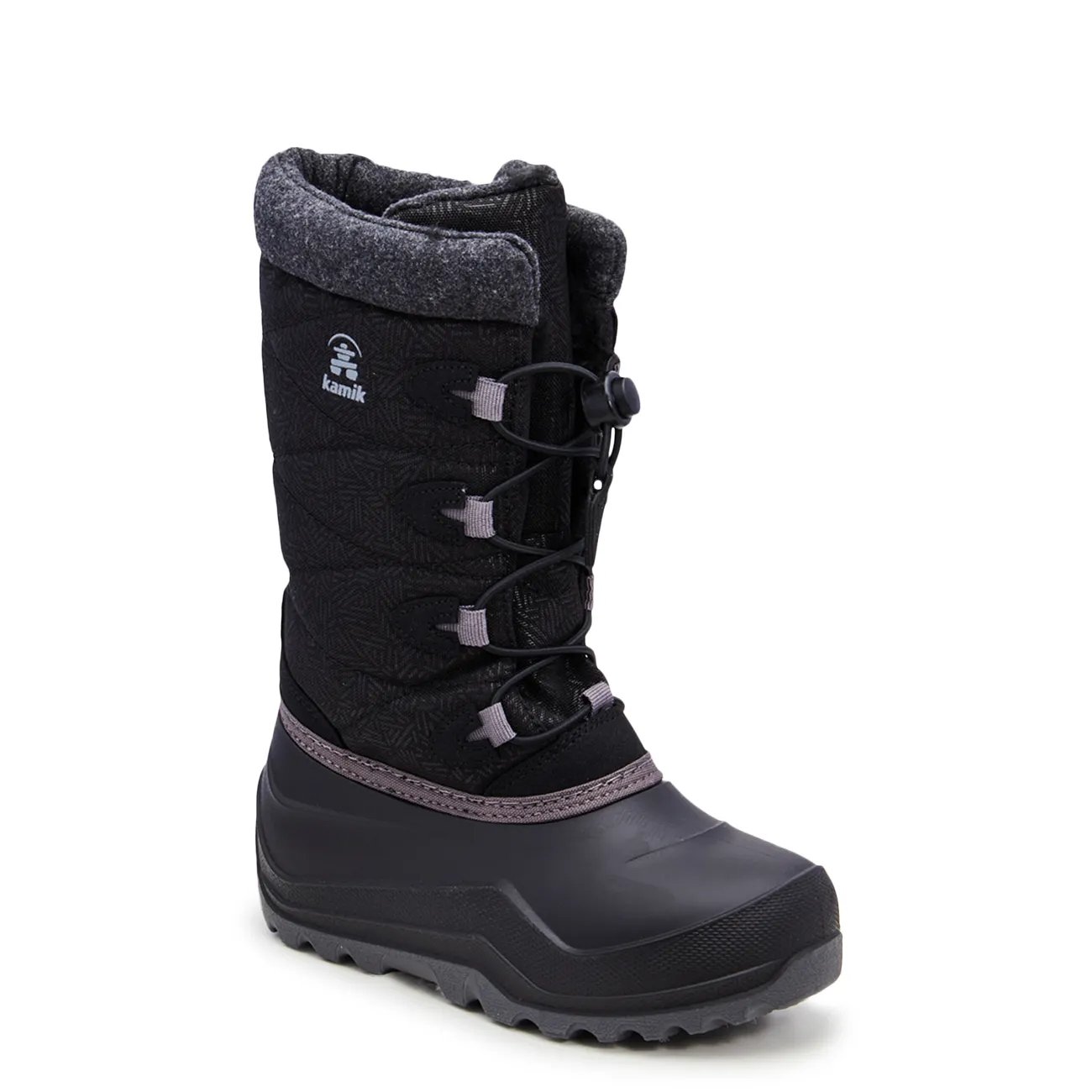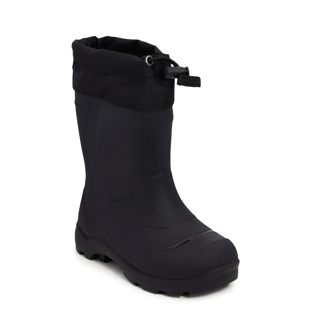 Stay warm and dry while building a snowman or having a snowball fight with friends in these youth unisex Flynn black/cloud burst winter boots by Kamik. Crafted with 600D waterproof nylon upper, these cold weather boots have a round toe and easy pull-on design with an adjustable hook-and-loop strap and an adjustable snow collar with bungee lock. A fixed liner with foam and fleece insulation and -32°C cold rating provides enhanced warmth while the waterproof rubber shell and outsole with deep treads offers reliable traction in snowy conditions.