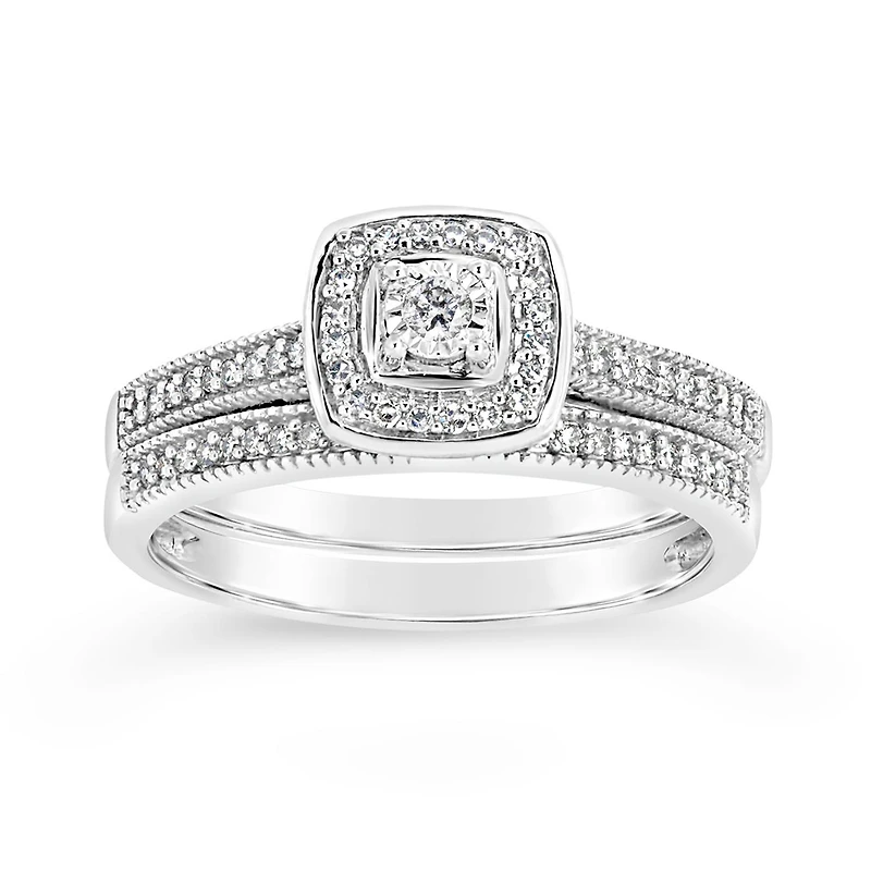 This .25ctw bridal set delivers remarkable sparkle, with its illusion setting and round diamond centre. Gorgeous round diamonds, set into a sparkling 10k white gold halo, and additional diamonds along the shoulders of the engagement ring and matching wedding band make this bridal set a beautiful symbol of your love.