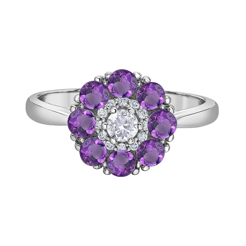 This stunning 10K white gold ring features a vibrant amethyst at its center, surrounded by a halo of sparkling Canadian diamonds. The combination of the rich purple gemstone and the brilliance of the diamonds creates a striking, elegant piece, perfect for special occasions or adding a touch of luxury to any collection.