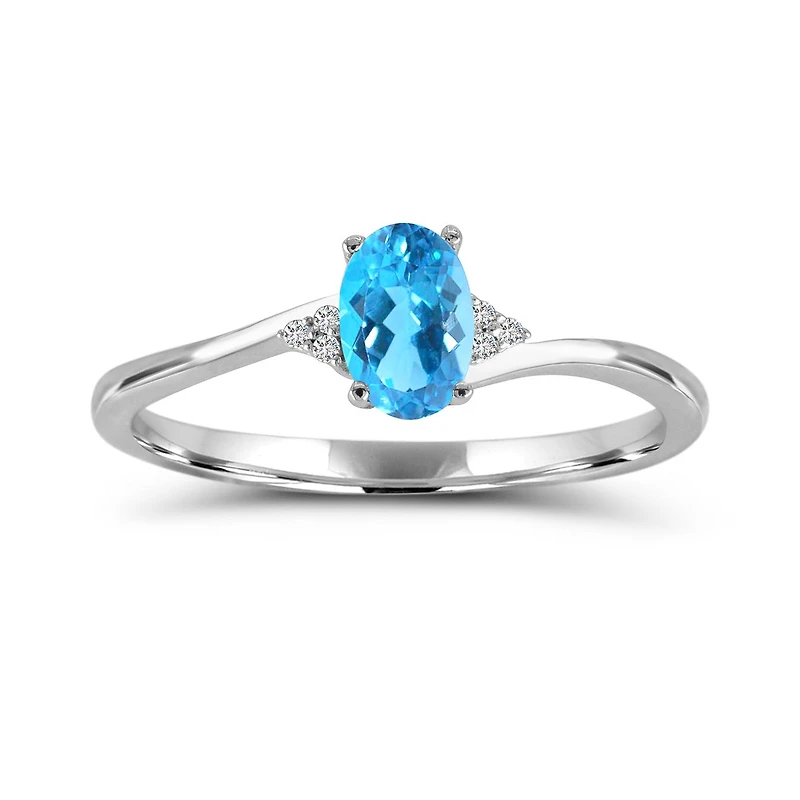 Crafted in 10K white gold, this ring features a vivid blue topaz that captures crisp brilliance and cool elegance. A refined accent of diamonds adds a subtle sparkle, enhancing the gemstone’s icy charm. Sleek and sophisticated, it’s a timeless piece that brings a refreshing touch to any ensemble.