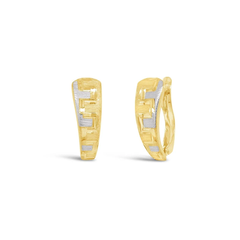 Treat yourself or the one you love with these elegant earrings. Crafted in two tone gold, and buffed to shine, these Greek Key design earrings will add a touch of elegance to any look.