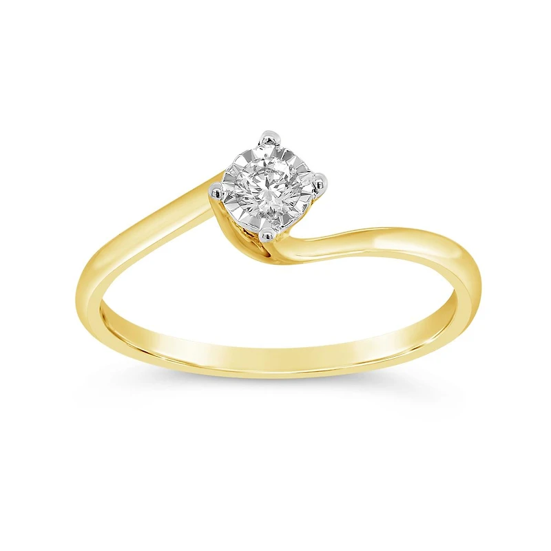 Whether gifted as a promise of years to come, or as a special accompaniment to the question, this crossover 0.10CTW diamond promise ring is a choice as unique as your love. Set in 10K yellow gold, with an offset design that compliments the round brilliant diamond prong mounted in the centre, this ring is sure to shine as brightly as your commitment.