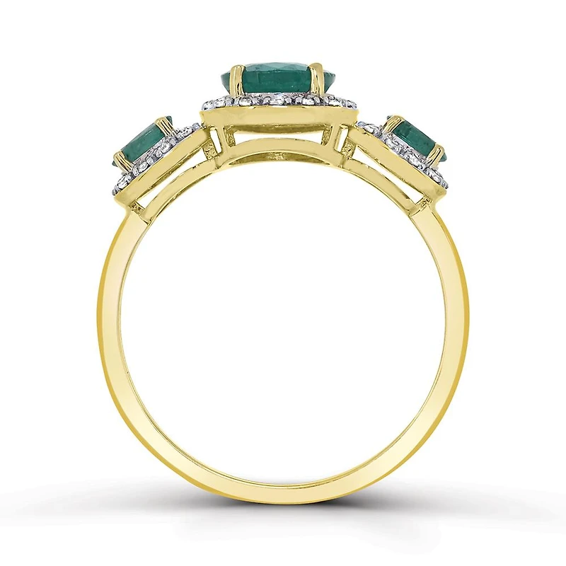 This bold and bright emerald and diamond ring from our Marseille Collection is crafted in 10-karat yellow gold and features oval and round cut genuine emeralds at its centre surrounded by shimmering diamonds. With vibrant gemstone colour and brilliant luster, this ring is sure to make a standout addition to any jewellery collection.