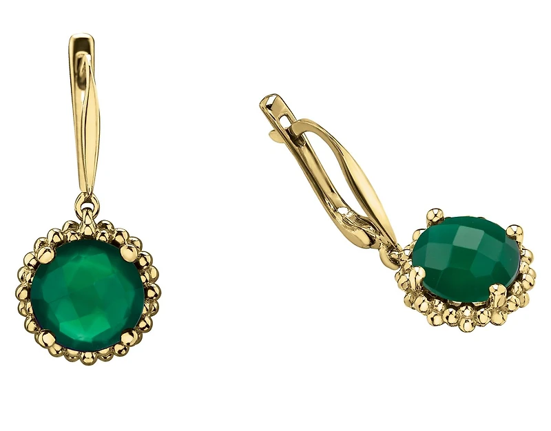 These classic and striking 10K yellow gold earrings showcase round cut green onyx. Day or night - these earrings will always complete your look!