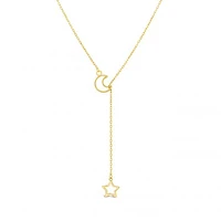 This necklace is a delicate representation of the night sky, featuring a graceful drop pendant adorned with a crescent moon and a star. Crafted in radiant 10K yellow gold, the celestial elements dangle with a subtle elegance. The symbolism of the moon and star adds a touch of mystique and magic to this piece.