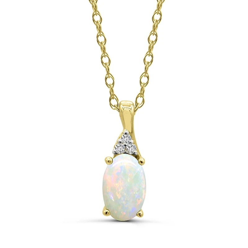 This 18" pendant in 10K yellow gold features a luminous opal that shimmers with an enchanting play of colour. A subtle accent of diamonds enhances its ethereal glow, adding a delicate sparkle to the design. Graceful and timeless, it’s a radiant expression of natural elegance and personal charm.