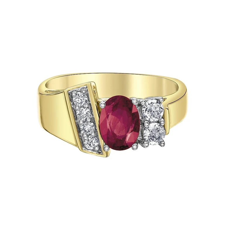 Crafted in glowing 10K yellow gold, this striking ring showcases an oval ruby accented by glimmering diamonds for a captivating contrast. Its asymmetrical design brings a modern twist to timeless elegance, making it a standout piece for any occasion.