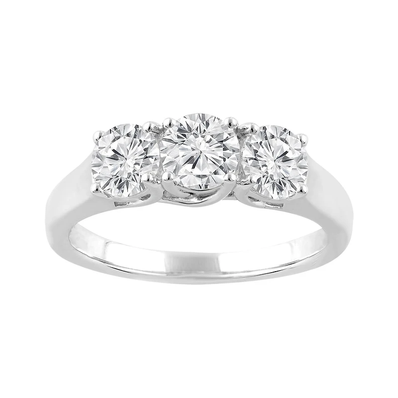 This elegant ring, crafted in 14K white gold, showcases a trio of lab-grown diamonds totaling 1.50CTW with SI2 clarity and HI colour. The classic three-stone design symbolizes enduring love, making it an ideal choice for commemorating significant moments and milestones.