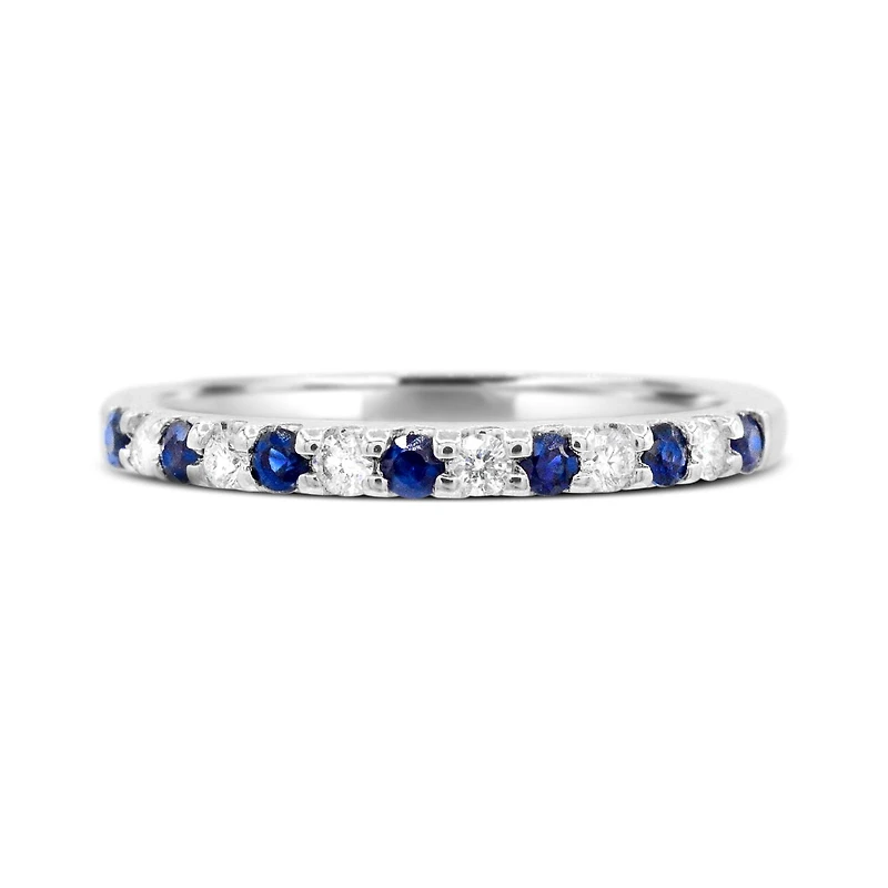 This charming ring features seven round cut sapphires and six brilliant cut diamonds. This magnificent band is crafted in lustrous 14k white gold and is sure to add a touch of elegance to your collection.