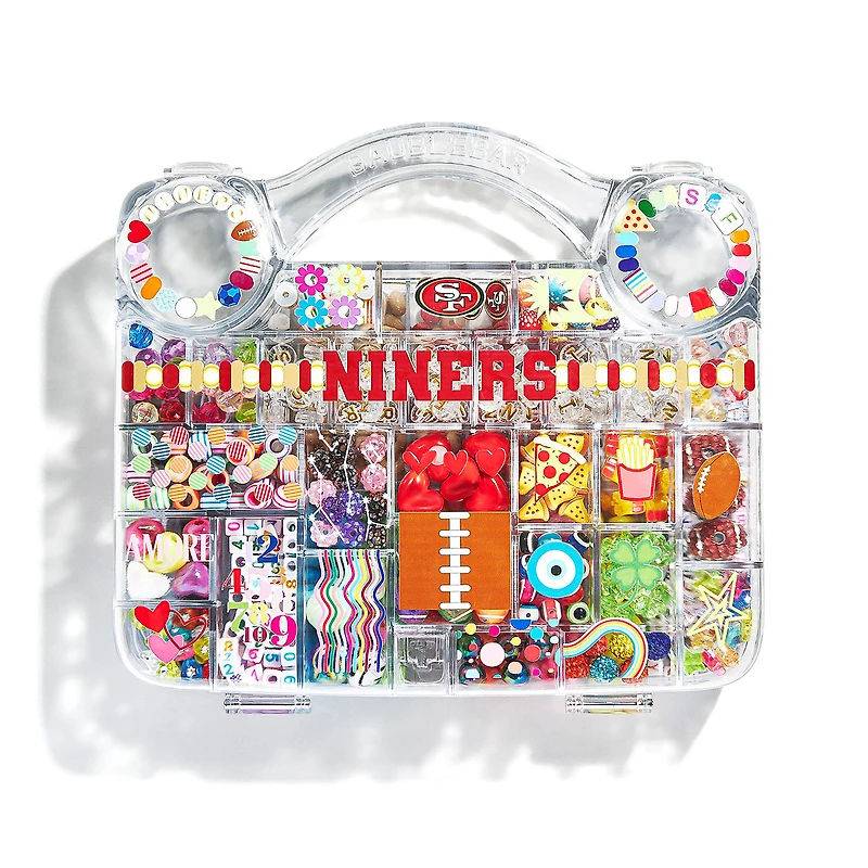 Create a unique accessory that shows off your San Francisco 49ers pride with this Custom Bead Kit from BaubleBar. Unleash your creativity and show off your San Francisco 49ers pride with over 625 beads for countless design options. With 25+ compartments filled with motif, color, and sparkle beads, plus 230 alphabet beads for adding names and phrases, this kit has everything you need to create unique, personalized jewelry.