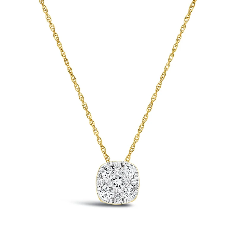 This dazzling bouquet 0.30CTW diamond pendant is a gorgeous addition to any jewellery collection. Set in 10K yellow gold for a timeless look and elegantly hanging from an 18 in chain, the dazzling pattern of the centre princess cut diamond surrounded by 8 pave mounted round brilliant diamonds creates dimension and visual interest beyond compare.