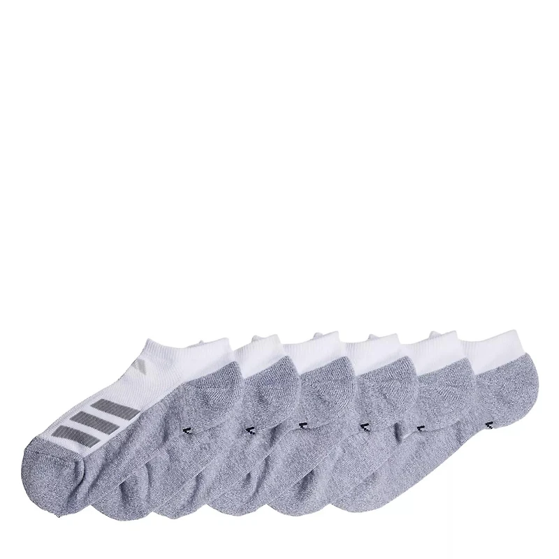 Breeze through intense workouts with the comfort of these youth boys' adidas 6-Pack Cushioned Angle Stripe white no-show socks. Comprising blend of polyester and elastane, these socks have a soft, stretchy feel, moisture-wicking yarn to keep feet dry, and the iconic signature 3-stripes design.