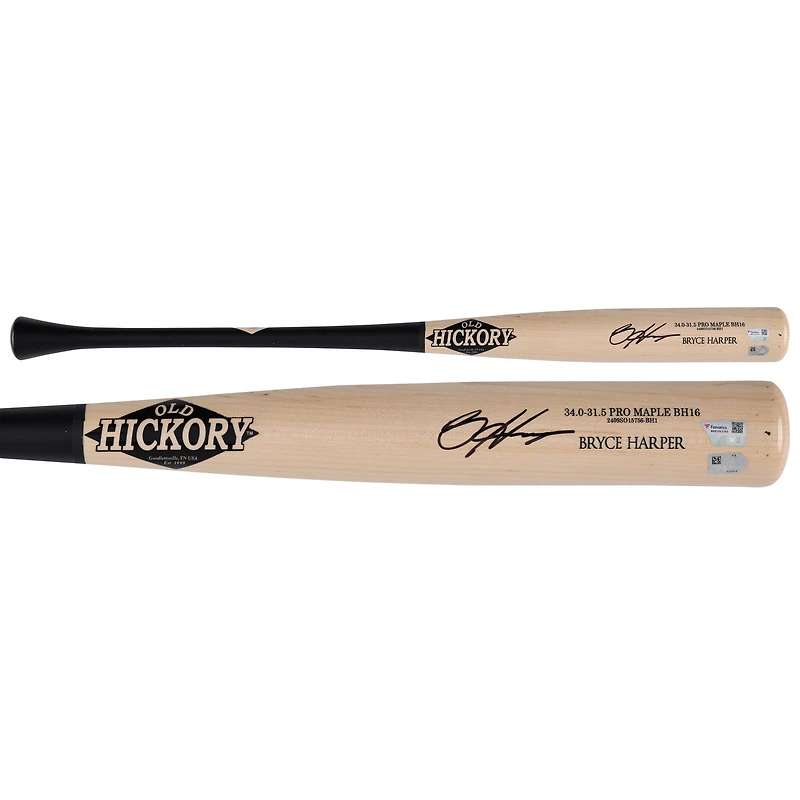 Elevate your collection of Philadelphia Phillies memorabilia with this Bryce Harper autographed Player-Issued Tan/Black Old Hickory Bat. Issued during the 2025 MLB season, this official gear brings a remnant of the two-time MVP's career right to you as a must-have memorabilia piece. Obtained under the auspices of Major League Baseball, it also includes an individually numbered, tamper-evident hologram that can be verified online to certify its authenticity.