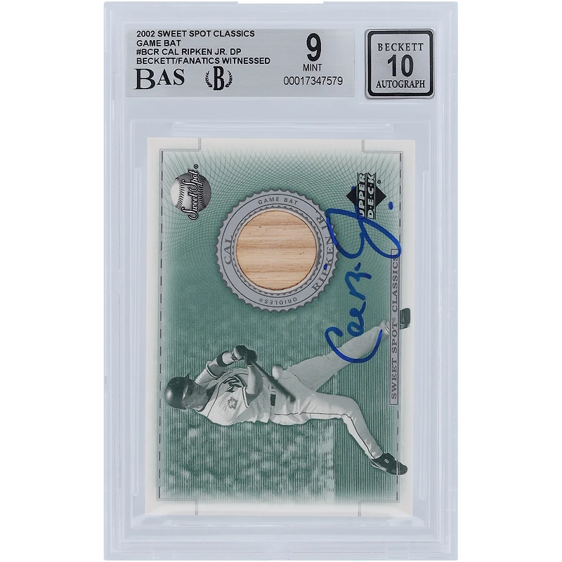 Enhance your Baltimore Orioles collection with this Cal Ripken Jr. autographed 2002 Upper Deck Sweet Spots Classics Game Bat Relic #B-CR Beckett Fanatics Witnessed Authenticated 9/10 Card. Encapsulated in a tamper-proof acrylic case for preservation, this striking card highlights the Baltimore Orioles legend with his unique signature to make it the ultimate collector's piece.