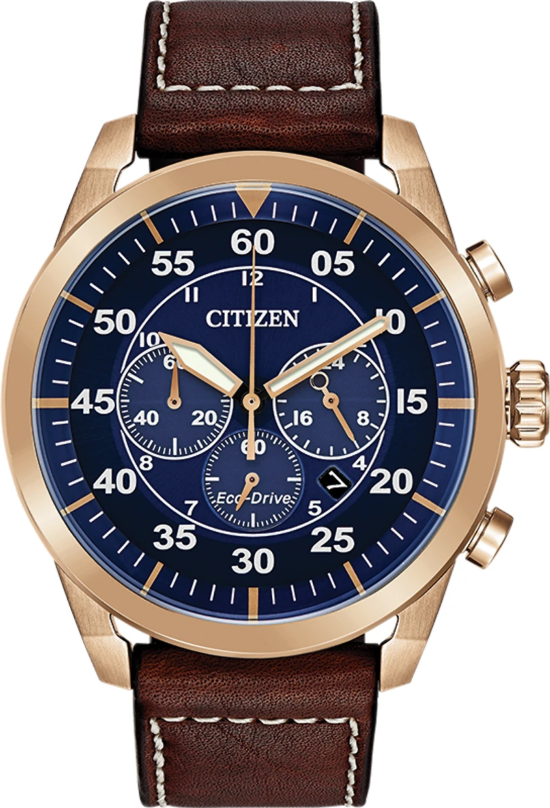Citizen Eco-Drive round rose gold-tone stainless steel case, brown leather strap, blue dial, 1/5 second chronograph, 12/24-hour time, screw-back case, date, 48mm case, WR100, buckle.
