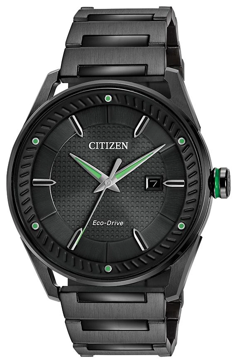 DRIVE from Citizen Eco-Drive, round black ion-plated stainless steel case and bracelet, black dial, 42mm case, WR100, fold over clasp with push button.
