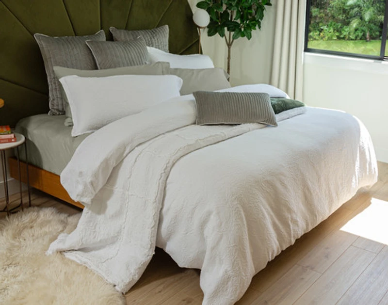 *Free Shipping only applicable for Duvet Covers. Pillow Shams and coordinating pieces purchased separately are excluded from Free Shipping promotion. Lovingly handcrafted in Portugal. Woven matelassé tiled pattern. Machine washable & dryable. Embrace the essence of coastal living with our Corinthia Duvet Cover, a design from our exclusive Portugal Reserve line. This elegant collection, reminiscent of seaside villa living, features a lightly raised tile pattern, crafted from a pure white woven matelassé jacquard that offers a luxurious weight and languid hand feel. For a subtle refresh, reverse the duvet cover to find a crisp, unvarnished canvas of long-staple cotton percale. Just like the caress of a salted sea breeze, Corinthia’s soft textures and soothing tone leaves you with a sense of everlasting calm and comfort. Details: Duvet cover and pillow sham feature a 1-inch self-flange. Duvet cover reverses to a white long-staple 200 thread count cotton percale. Duvet cover has 4 corner anchor ties that attach to duvet to keep it in place and prevent shifting. All items include YKK zipper closures. Coordinating items sold separately. About Portugal Reserve. Drawing from generations of expertise, each piece in our Portugal Reserve line has been lovingly handcrafted in Guimarães, Portugal, and has been curated to ensure exceptional quality and enduring charm. FABRICATION: 100% Cotton. Exclusive of Trim. CERTIFICATIONS: OEKO-TEX® Certified. This product has been tested for harmful substances and meets STANDARD 100 by OEKO-TEX®. Certification number: 10531CIT CITEVE. ITEMS AVAILABLE (IN STORES & ONLINE): All coordinating items are sold separately. DUVET COVER (SOLD INDIVIDUALLY). Queen: 90" W x 90" L. King: 106" W x 90" L. Super King: 114" W x 93" L. PILLOW SHAMS (SOLD INDIVIDUALLY). Queen: 30" W x 20" L. King: 36" W x 20" L. SKU: PR23CODC. WASHING INSTRUCTIONS. Machine wash cold on gentle cycle, inside out with zippers closed. Use a gentle detergent. Tumble dry on a gentle setting with low or no heat and remove promptly at cycle end. Add QE Home Wool Dryer Balls to reduce wrinkles and increases drying efficiency. Touch up with a medium heat iron or steamer as needed. Do not use bleach or fabric softener. Do not dry clean.. QE Home Corinthia Duvet Cover, Geometric, White, Queen