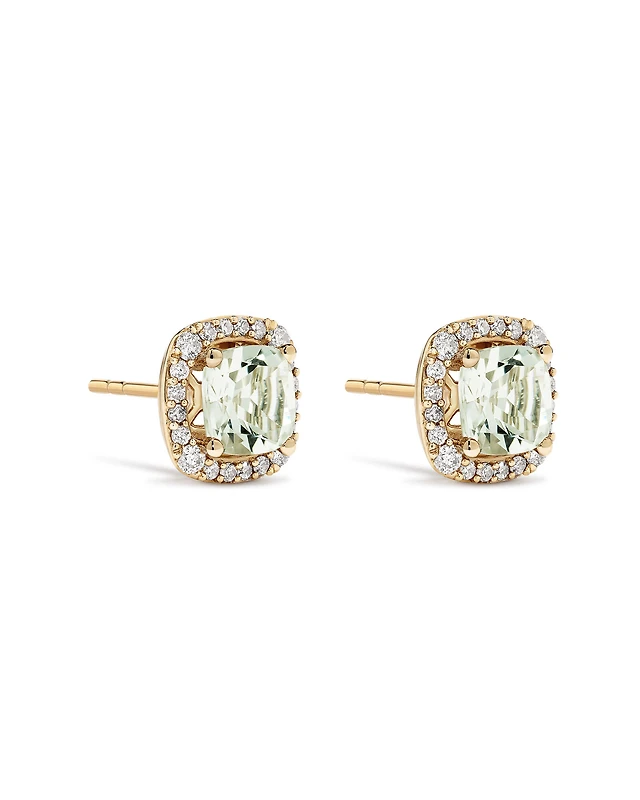 Cushion Cut Green Amethyst Gemstone and 0.32 Carat TW Diamond Halo Stud Earrings in 10kt Yellow Gold
