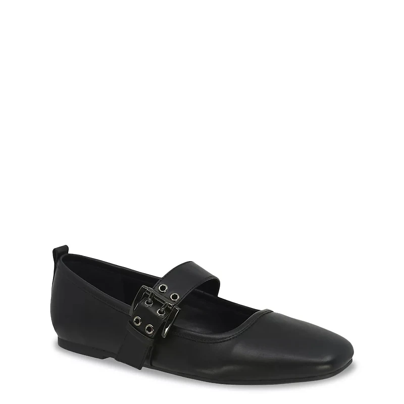 Team up your casual attire with these women's Kelly & Katie Felicity black flats for a refined style. Made of faux leather upper, these Mary Jane ballet flats have a square toe design adds a fashionable look and an instep with grommets and buckle closure for an adjustable fit. Smooth synthetic lining and a soft padded insole cradle your feet with each step. The rubber midsole and TPR outsole lend support and good grip. This style is exclusive to Designer Brands Canada.