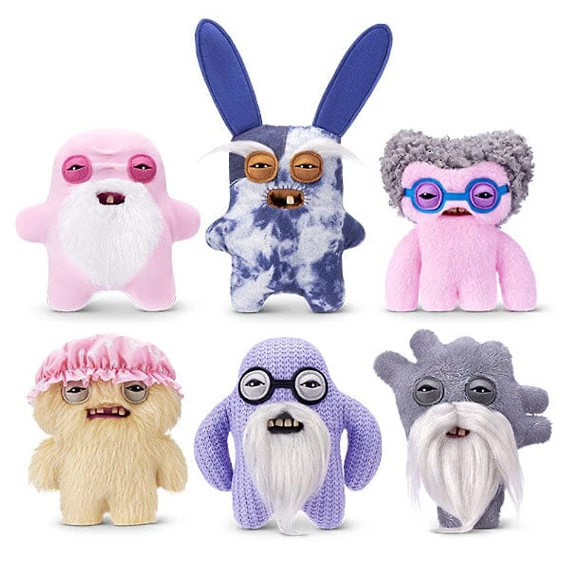 • Meet the Old Fogies (Styles Ship Assorted): Mr. Needles – A periwinkle knit-textured body paired with spectacles and a long white beard. Looks polite. Absolutely isn’t. Captain Cardiac – Soft grey fur and a flowing white beard that suggests wisdom… until you notice the squint and the teeth. Oogah Boogah – Pink-bodied chaos with a massive white beard, tired judgmental eyes, and one iconic straggler tooth. Rabid Rabbit – Blue and white tie-dye fur, wild eyebrow hairs, and a lone tooth that screams “still feral.” Squidge – Bright pink fur, thick blue glasses, and a curly grey “perm” that radiates disapproval. Gabby Gibbler – Beige fur, cozy pink sleeping bonnet, and the unsettling aura of someone who knows your secrets.