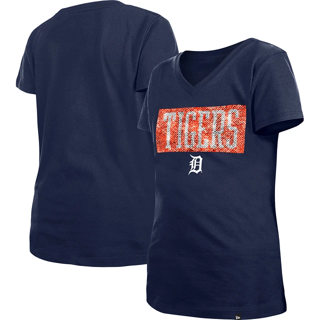 Girls Youth New Era Navy Detroit Tigers Flip Sequin Team V-Neck T-Shirt