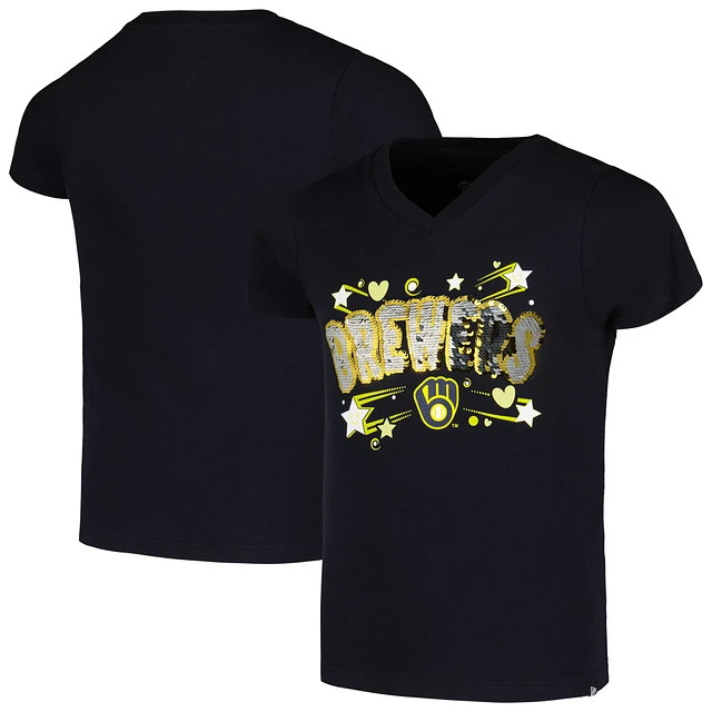 Girls Youth New Era Navy Milwaukee Brewers Sequin V-Neck T-Shirt