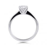 This delightful 14k white gold, Glacier Fire diamond solitaire ring is the essence of delicate grace. The white gold band tapers to hold a single .70-carat brilliant Canadian diamond solitaire. The delicate detail of this ring offers a timeless elegance sure to convey your endless love.