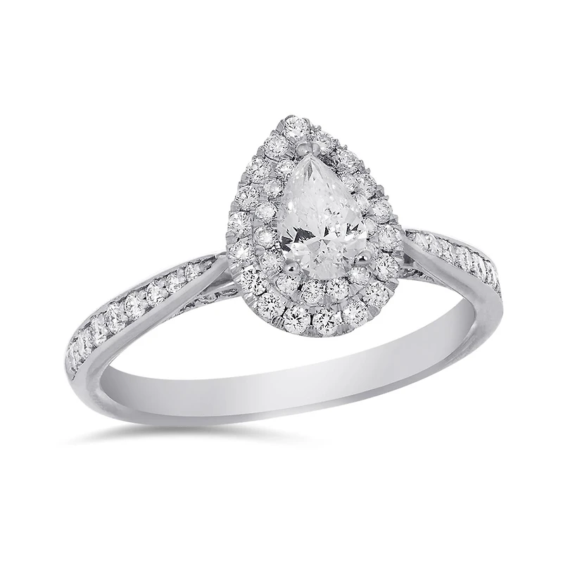 Let your love shine with this breathtaking .75ctw bridal ring from our exclusive Glacier Fire Canadian Diamond Collection. A double halo adds elegant sparkle to perfectly compliment the dazzling .30ct centre teardrop Canadian diamond. Additional diamonds set along the band complete this stunning bridal ring.