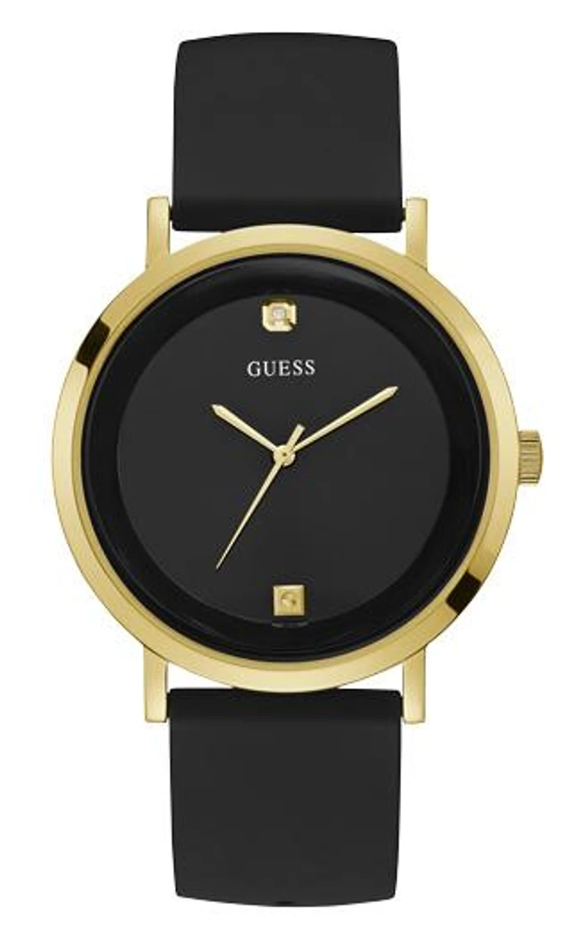 A sleek classic, the black analog watch features gold-tone trim, a logo detail and a silicone strap. Gold-tone case. U1264G1