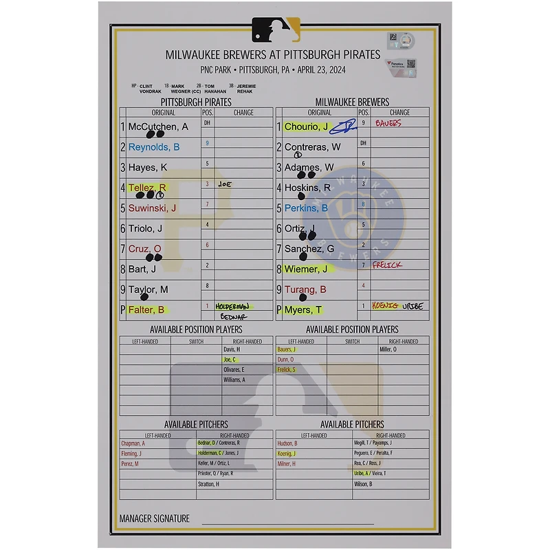Jackson Chourio Milwaukee Brewers Autographed Game-Used Lineup Card vs. Pittsburgh Pirates on April 23, 2024