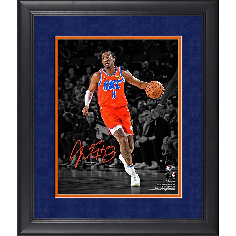 Elevate your collection of Oklahoma City Thunder memorabilia by picking up this Jalen Williams facsimile signed Framed 11" x 14" Spotlight Photograph. Featuring a striking image of the Oklahoma City Thunder star, it's a must-have addition for any die-hard Jalen Williams fan.