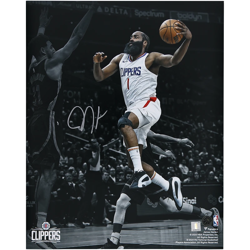 Elevate your LA Clippers memorabilia collection with this James Harden autographed 16" x 20" Layup Photograph. This stunning image captures Harden driving to the basket during a game against the Golden State Warriors, his signature adding a personal touch to this moment frozen in time. Additionally, this photo is authenticated with FanSecure technology and its individually numbered, tamper-evident hologram can be verified online.