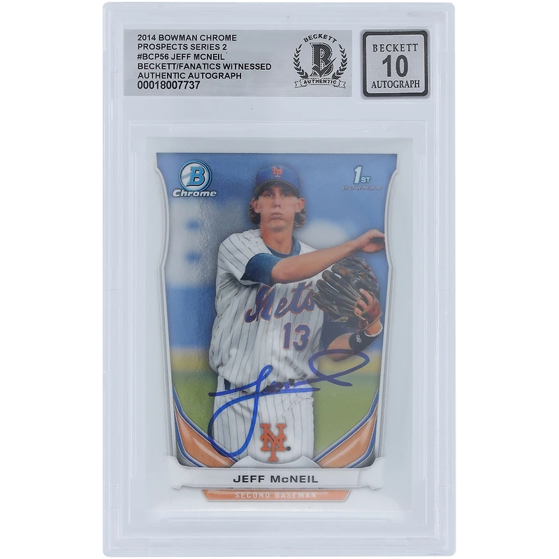 Elevate your collection of New York Mets memorabilia by picking up this Jeff McNeil autographed 2014 Bowman Chrome Prospects #BCP56 Beckett Fanatics Witnessed Authenticated 10 Card. Featuring a striking signature from the New York Mets star, it's a must-have addition for any die-hard fan or serious collector. This card was obtained under the auspices of the Major League Baseball Authentication Program and can be verified by its numbered hologram at MLB.com