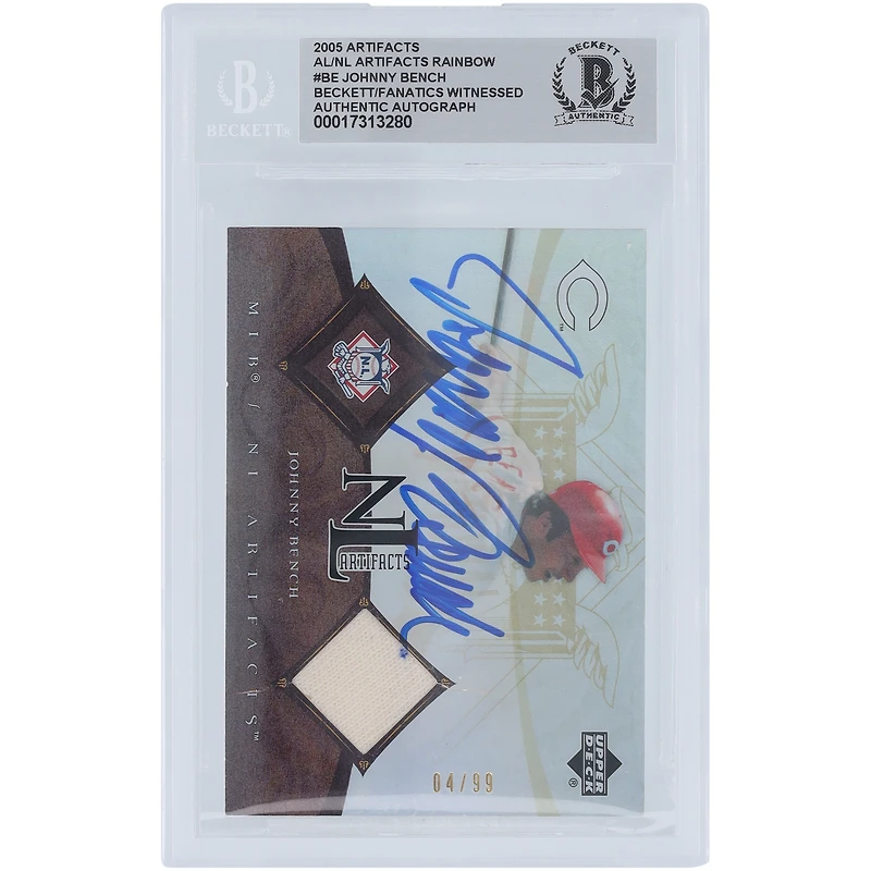 This Johnny Bench autographed 2005 Upper Deck Artifacts Rainbow Jersey Relic #BE #/99 Beckett Fanatics Witnessed Authenticated Card is ready to help you display your Cincinnati Reds fandom. Encapsulated in a tamper-proof acrylic case for preservation, this striking card also showcases the unique signature of Johnny Bench to make it the ultimate collector's item.