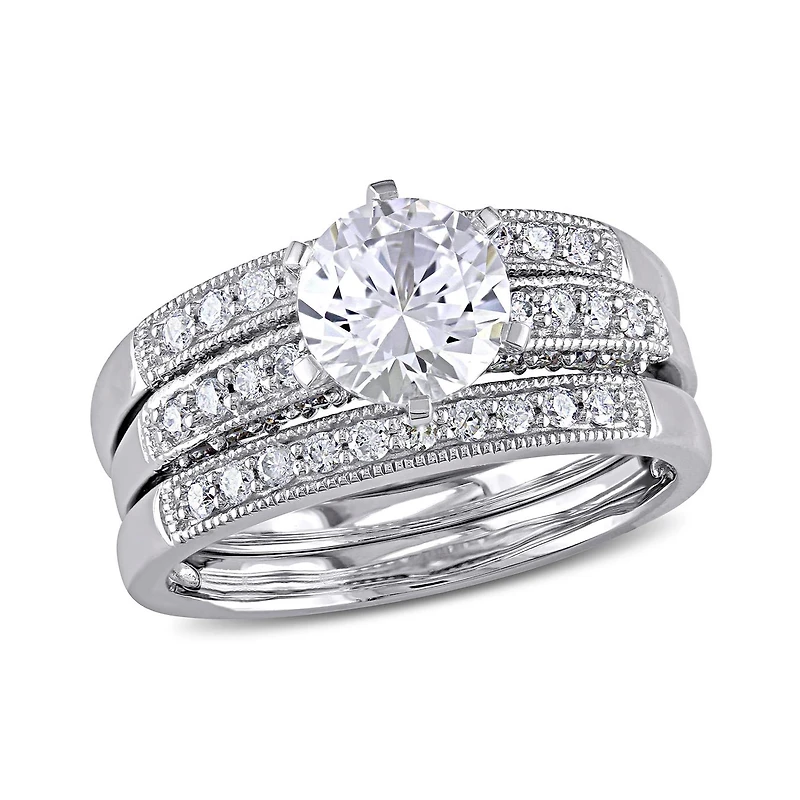 This glamorous bridal ring set from the is crafted in 10-karat white gold and features a created white sapphire sitting atop a 3 bands bedecked with diamonds in between the milgrain edges. Sweep her off her feet when you give her this beautiful ring.