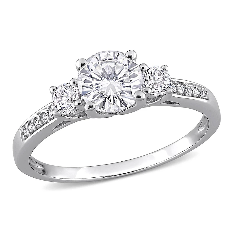 Sign up for a life filled with every emotion when you slide this classy 3-Stone Engagement Ring on her finger. Crafted in sparkling white gold, this elegant ring showcases one (6x6mm), two (3x3mm) round-cut, prong-set created white sapphire gemstones and 12 round-cut, pave-set diamonds (G-H, I2-I3). Polished to brilliance, this flawless ring is perfect to mark the beginning of something new and exciting.