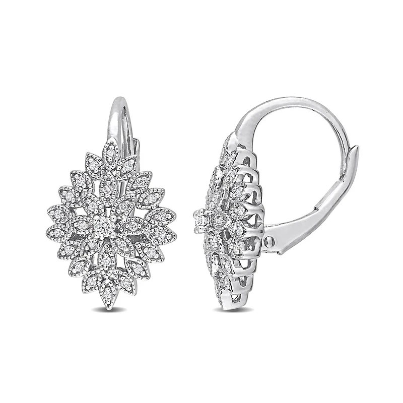 These diamond filigree flower vintage earrings are crafted in sterling silver and feature 60 round-cut, prong and pave-set white diamonds in a unique marquise floral drop design. Enhanced with a milgrain finish, these modern leverback earrings are a perfect addition to any jewellery collection. These diamond earrings are a great gift for a woman with a classic and trendy sense of style.