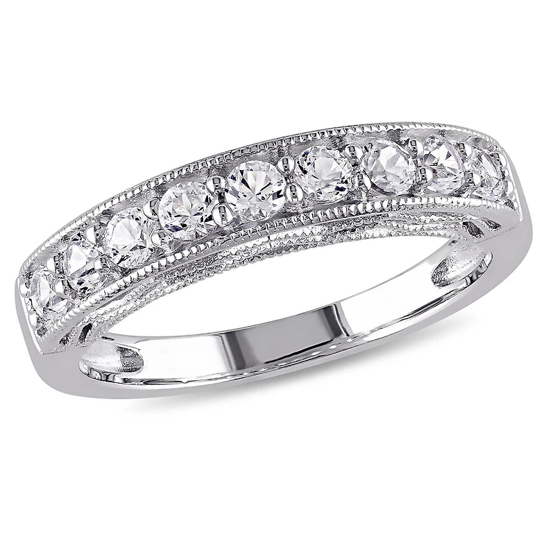 Let your relationship sparkle till eternity with this glamorous Semi-Eternity Anniversary Ring. Crafted in lustrous sterling silver, this classic ring showcases nine round-cut, pave-set created white sapphire gemstones (2.5x2.5mm). Polished to a brilliant shine with milgrain finish, this enchanting ring will be her go to accessory for every special occasion.
