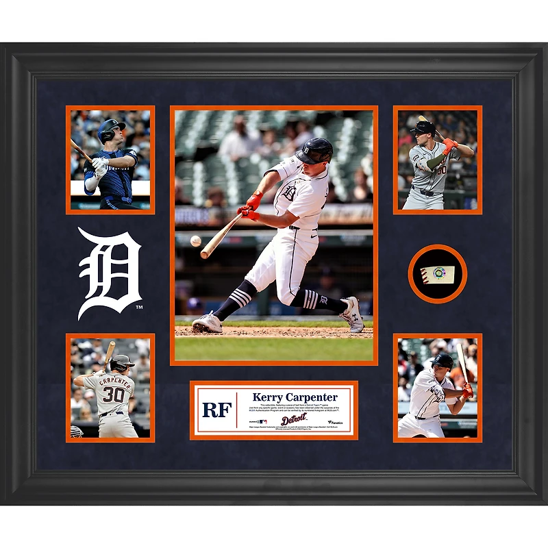 Take your collection of Detroit Tigers memorabilia to the next level with this Kerry Carpenter Framed 5-Photo Collage with Piece of Game-Used Baseball. Whether displayed in your home or office, it's the perfect way to highlight your passion for Kerry Carpenter for years to come.