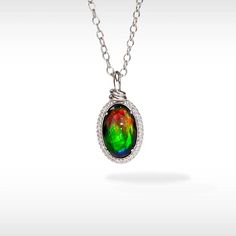 A symbolic merging of soft ropes and strong knots celebrates a lifelong odyssey of exploration and discovery, anchored in resilience. A or AA grade Ammolite 22 x 14mm Oval Ammolite Pendant 925 Sterling Silver Accented with 1.5mm White Topaz  Pendant Dimensions: 38.1 x 19.3 mm Chain Length: 16-18 Inch Adjustable Lobster Clasp with Ammonite Accent Like all gemstones, Ammolite should be treated with care and attention. -Avoid exposure to direct heat. -Do not over-expose to water. -Avoid hard impact to the stone -Do not clean in ultrasonic cleaners -Use a soft, none-abrasive cloth to clean your Ammolite jewellery.