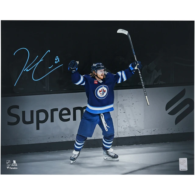 Kyle Connor Winnipeg Jets Autographed 16" x 20" Blue Jersey Celebrating Spotlight Photograph