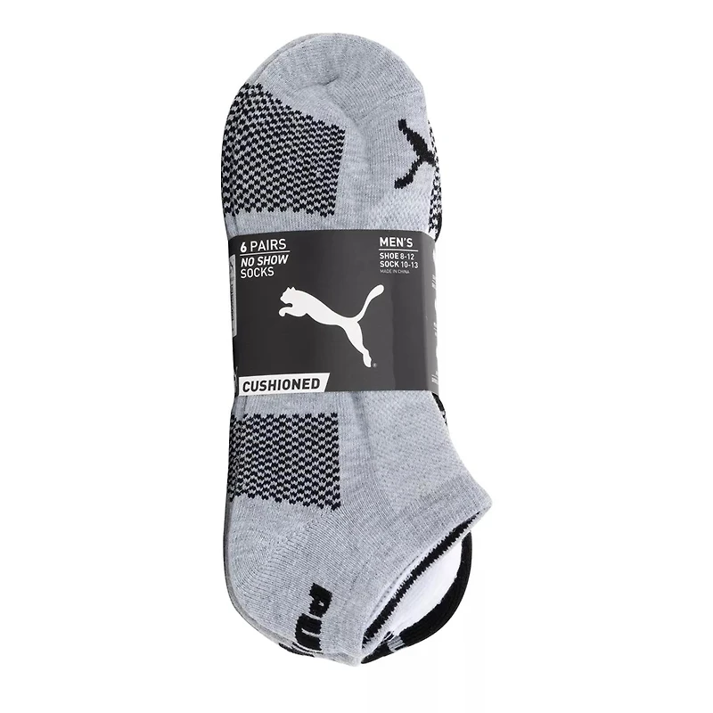Do better at everyday workouts with these men’s Puma No Show white/black/grey socks. They are made with 96% polyester 2% rubber 2% spandex and feature a comfort toe seam, are machine washable and come in a pack of 6.