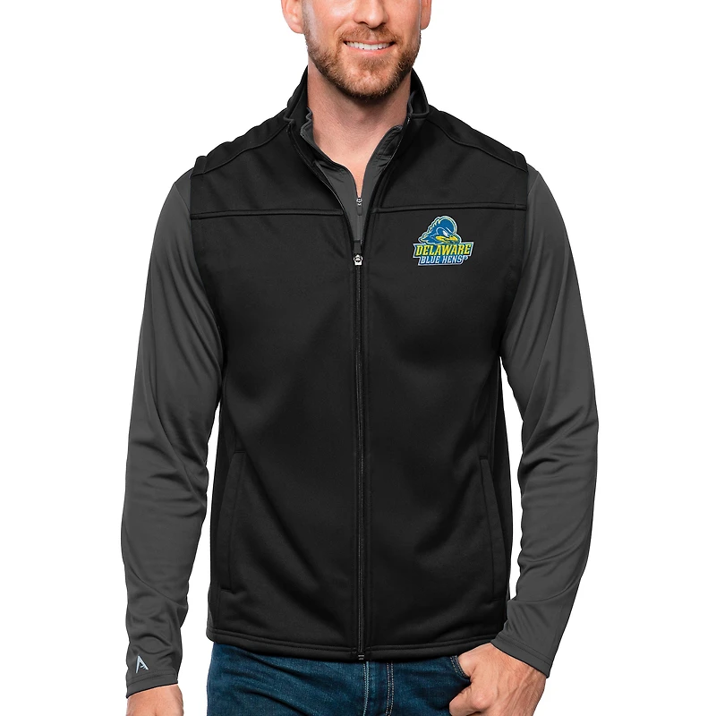 Men's Antigua Black Delaware Fightin' Blue Hens Links Full-Zip Golf Vest in Vernon, BC