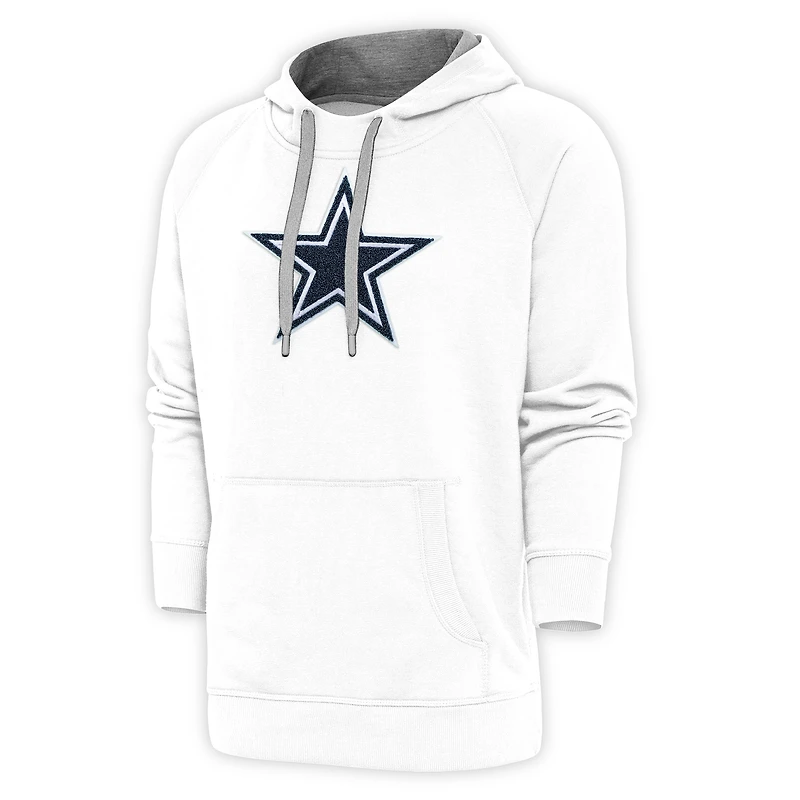 The Men's Antigua White Dallas Cowboys Victory Chenille Pullover Hoodie is the ultimate way to show unwavering support for the Dallas Cowboys. This midweight hoodie, perfect for moderate temperatures, features a cozy cotton and polyester blend for comfort throughout the game. Embroidered chenille graphics proudly display the iconic Dallas Cowboys logo, while the front pouch pocket provides convenient storage for essentials. Whether cheering from the stands or watching from home, this hoodie is the perfect way to represent your favorite team in style.
