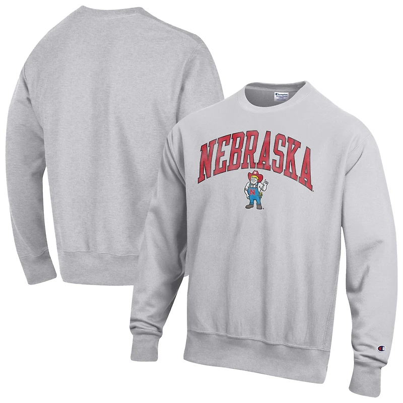 Men's Champion Gray Nebraska Huskers Distressed Arch Over Logo Reverse Weave Crew Neck Sweatshirt in Vernon, BC