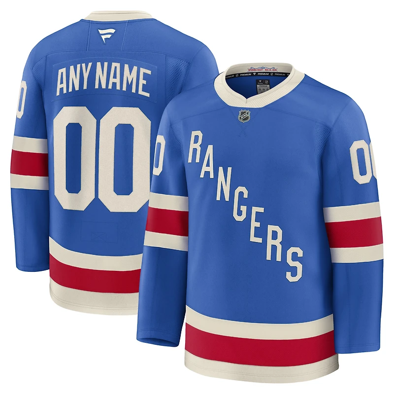 We want fans to celebrate their fandom by customizing and personalizing certain products. For this customizable product, we invite customers to tell us how they would like their preferred name or text to appear by typing it into the indicated field. However, because a customer can type proposed customization text into the field and complete the order through the website, not all proposed customization text will be accepted. Please note that Fanatics may reject and cancel any customization order for any reason, including messages deemed offensive or inappropriate. Show your support for your favorite team with this New York Rangers Centennial Premium Custom Jersey. This premium custom jersey is designed for a relaxed fit, ensuring maximum comfort whether you're on your feet or cheering from the stands. The sewn-down tackle twill with high-definition cresting and shoulder patches showcases your Rangers pride with sharp, long-lasting details.